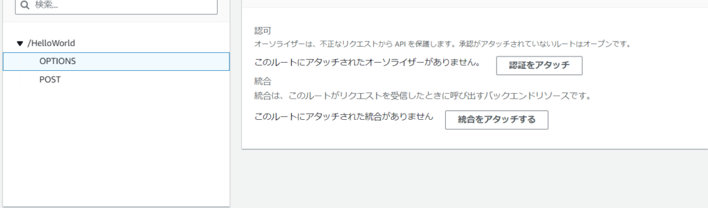 また、もう一つの重要なことはOPTIONSの設定が必要だということです。これは後述のプリフライト通信の中で使用されています。これを設定しないとプリフライト通信を完了出来ません。これはAPI Gatewayの仕様に起因するもののようです(あんまりちゃんと説明されてない上に内容が難しいから初学者にはよくわからん)