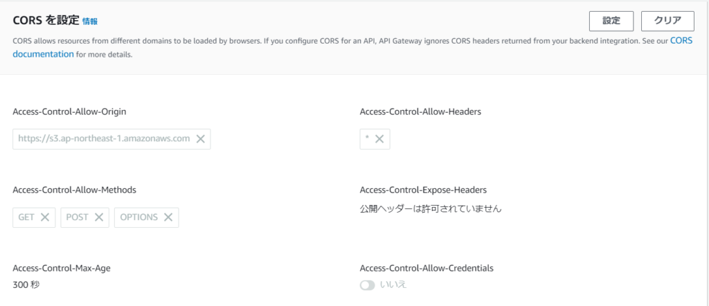 このコード記述に相当するものがAPI GatewayにおけるCORS設定というわけです。